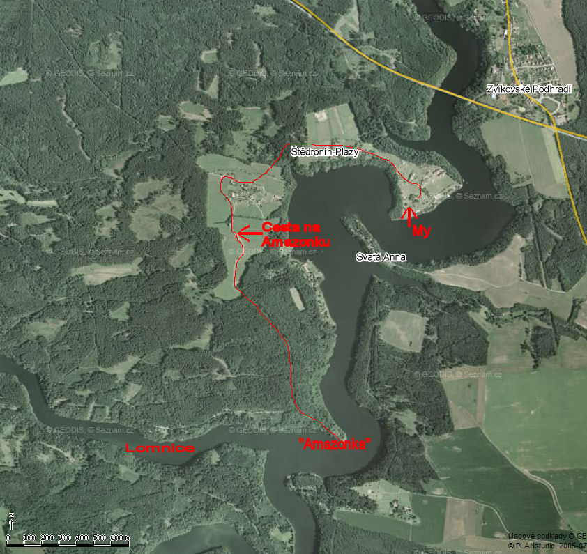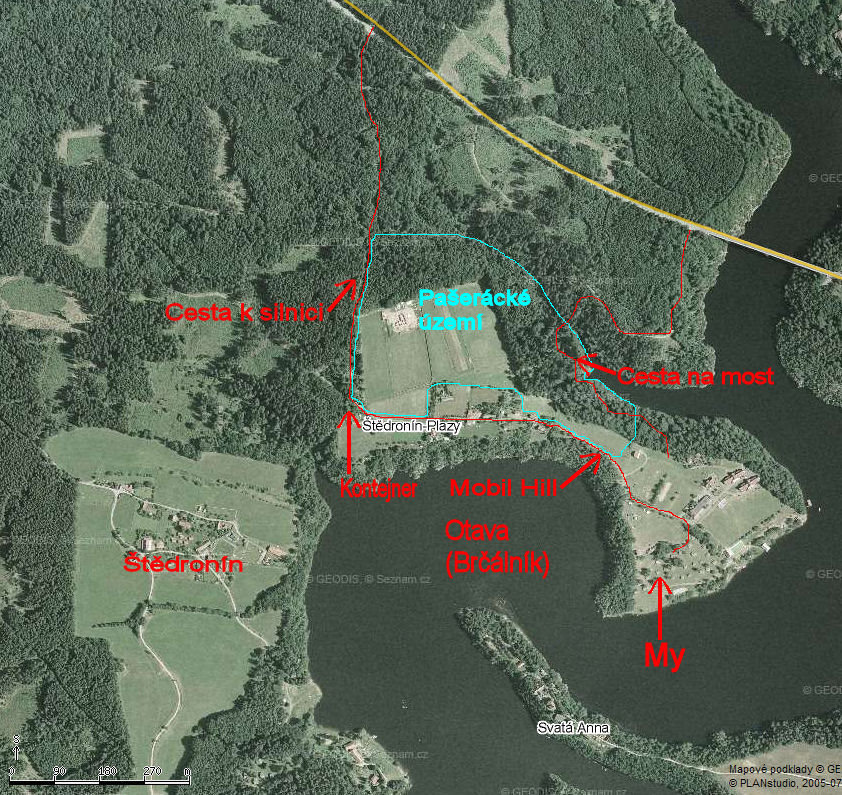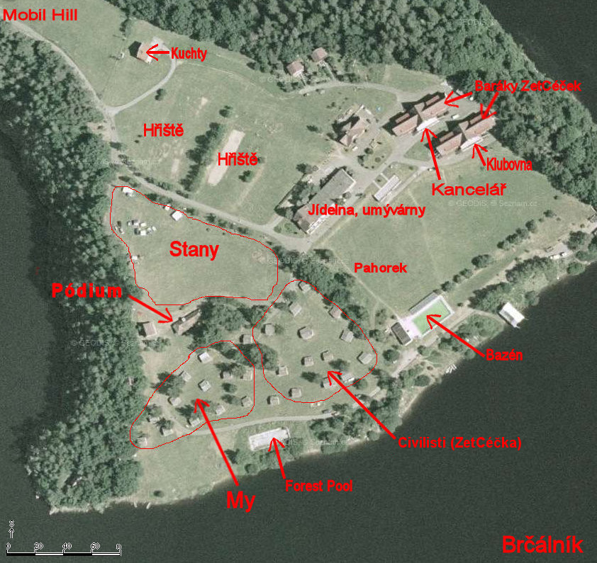 Abyste se mohli lépe zorientovat (zejména ti, kdo tam ještě nebyli), máte níže uvedeny 3 satelitní pohledy na tábořiště s různou úrovní podrobností a popisem důležitých bodů: